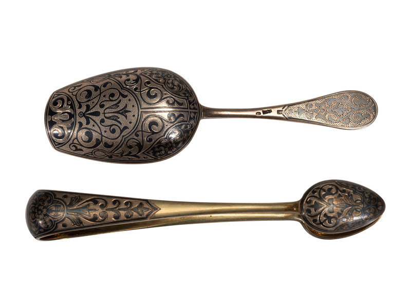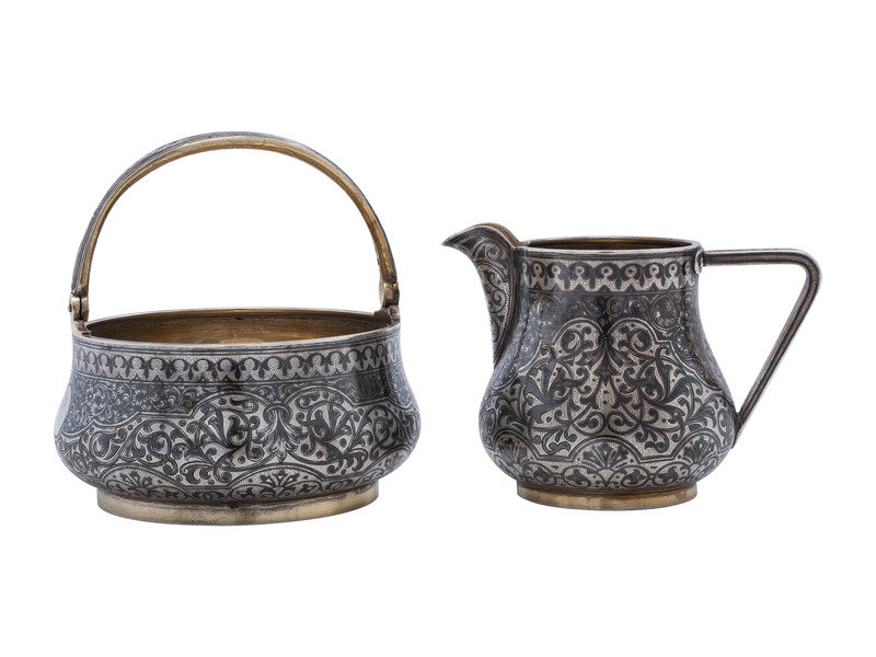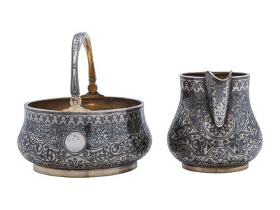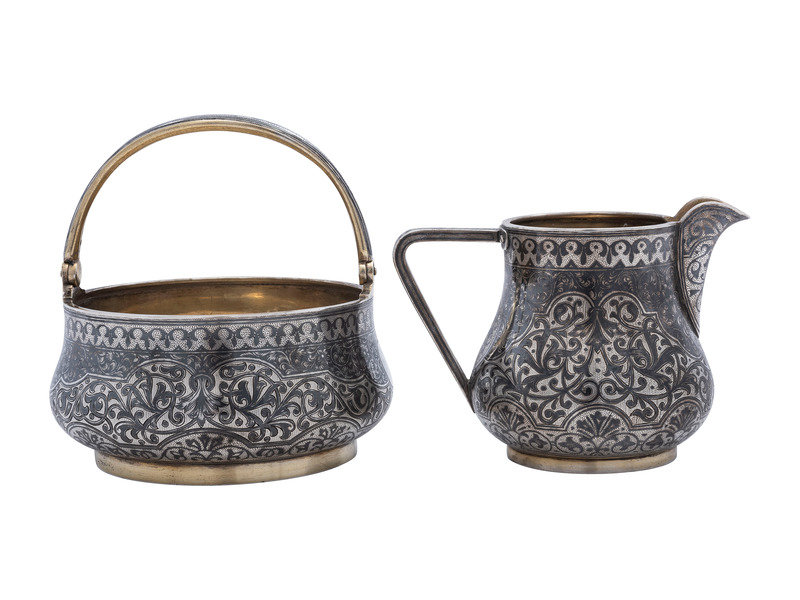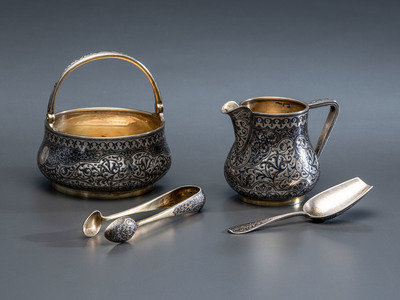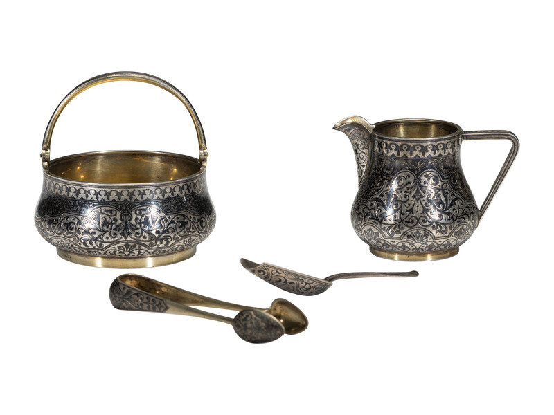 A Russian Niello Inlaid Silver Four-Piece Serving Set