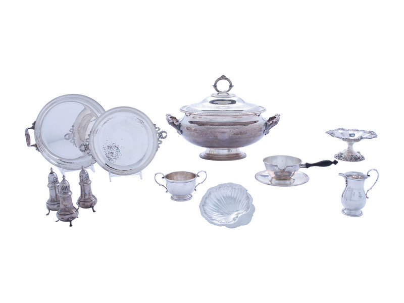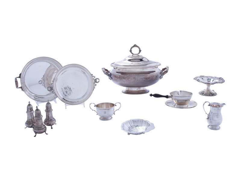 also including a Christian Dior silverplated bowl, a silverplated tureen, and a Continental .900 silver bowl.