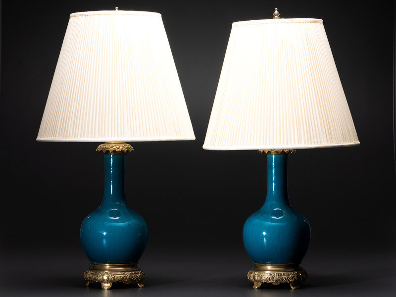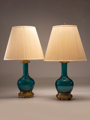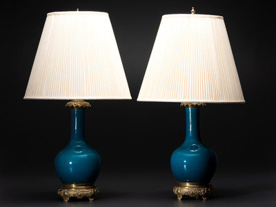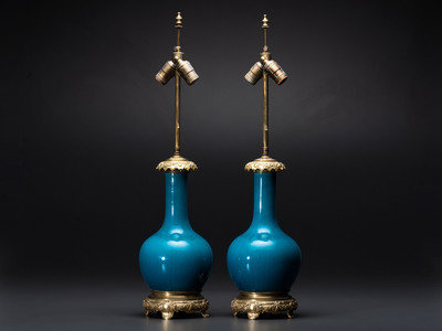 A Pair of Chinese Porcelain Bottle Vase Table Lamps with Bronze Mounts