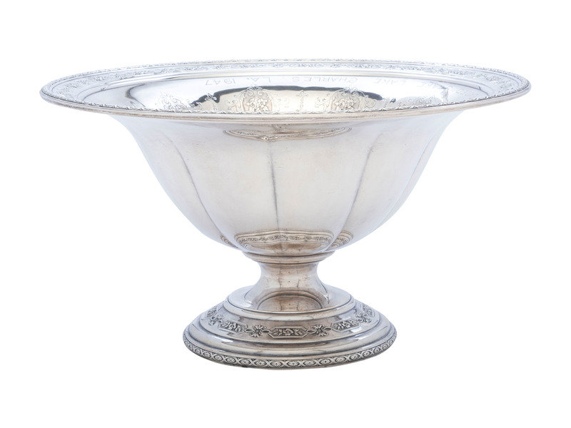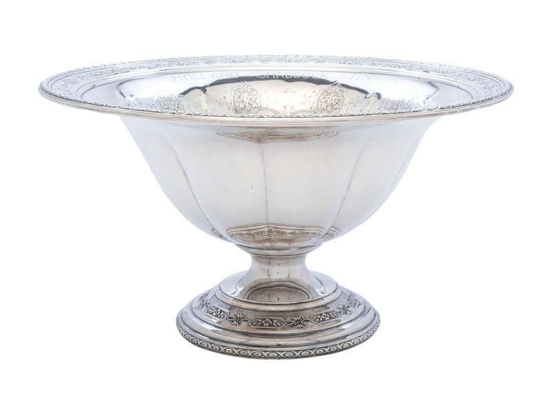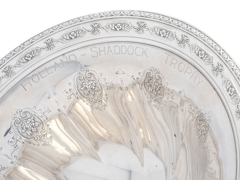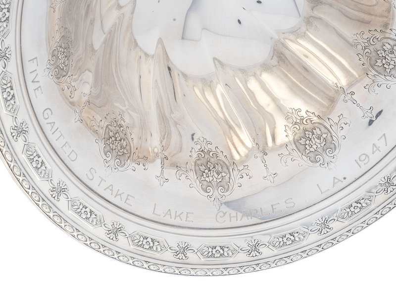 with maker's mark on base and inscription around rim reading Holland - Shaddock Trophy / Five Gaited Stake Lake Charles, L.A. 1947.