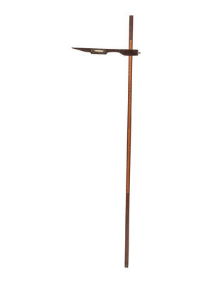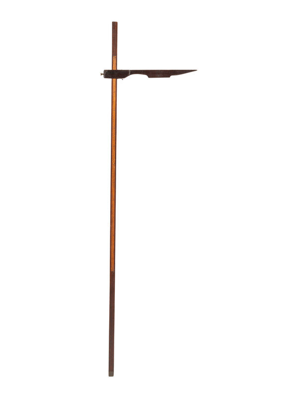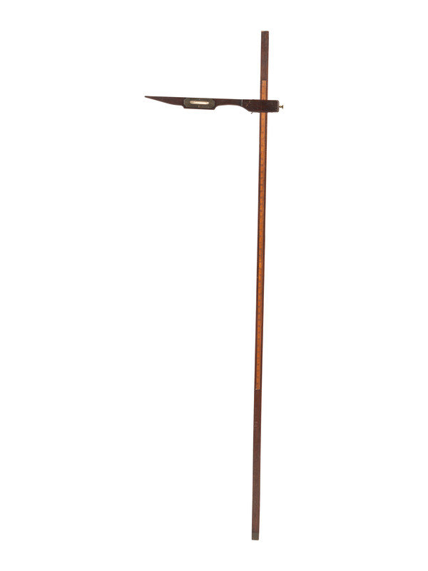 mixed woods with inset brass and glass spirit level, marked in hands on one side and feet and inches on other.