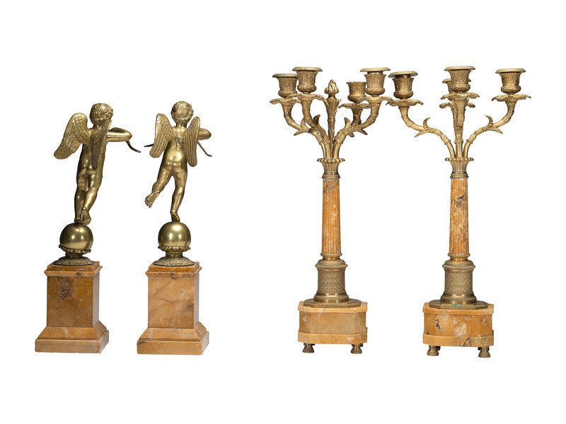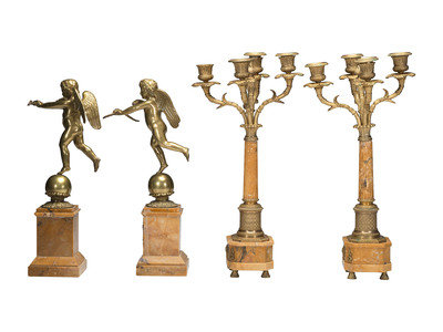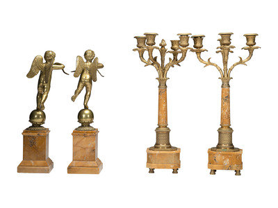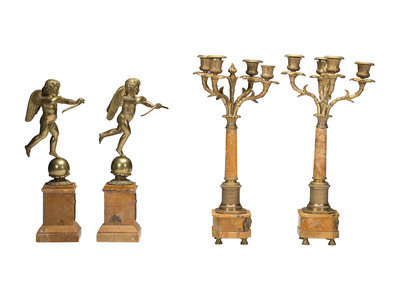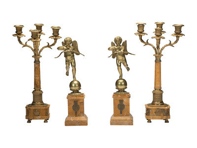A Pair of Brass and Marble Cherub Bookends and Four-Light Candelabra