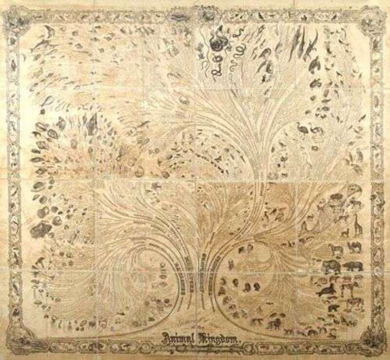 The Animal Kingdom organized & richly illustrated from Phyla to Species in dynamic branching & flowing current. Executed by an American woman & published two years before Darwin's On the Origin of Species.