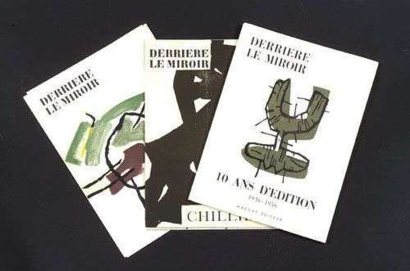 Derriere Le Miroir & C: Derriere Le Miroir. 10 Ans D'Edition, 1946-1956. (Paris): Maeght, 1956. Folio, orig. color pictorial wrappers, glassine. Orig. color lithographs by Miro, Chagall & Bazaine. * Derriere Le Miroir, issues 82-83-84; 85-86; 87-88-89; 90-91, Paris, 1956, folio, orig. color pictorial wrappers. Tal Coat, Braque, Miro, Chillida issues. * Maeght Editeur Catalogues, 1957-1966, duplicates of 1964-1965 & 1966 catalogues. Folio, orig. wrappers. All generally clean & bright in cloth chemise.
