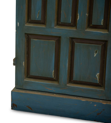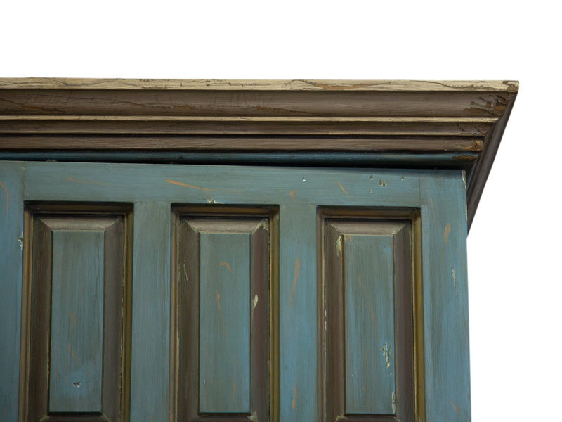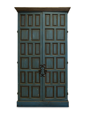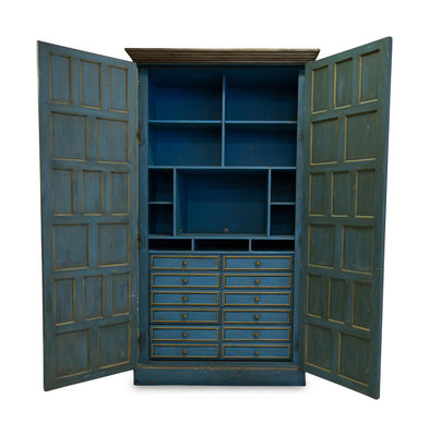 with fold-back paneled doors; the upper section have shelves above two banks of six shallow drawers.