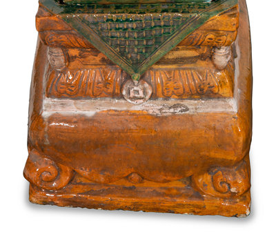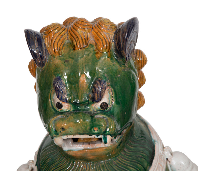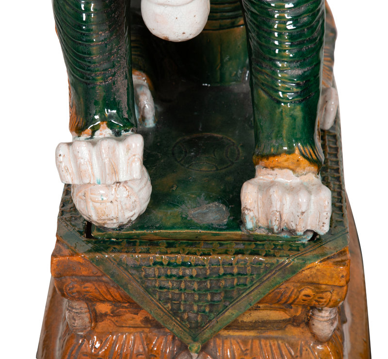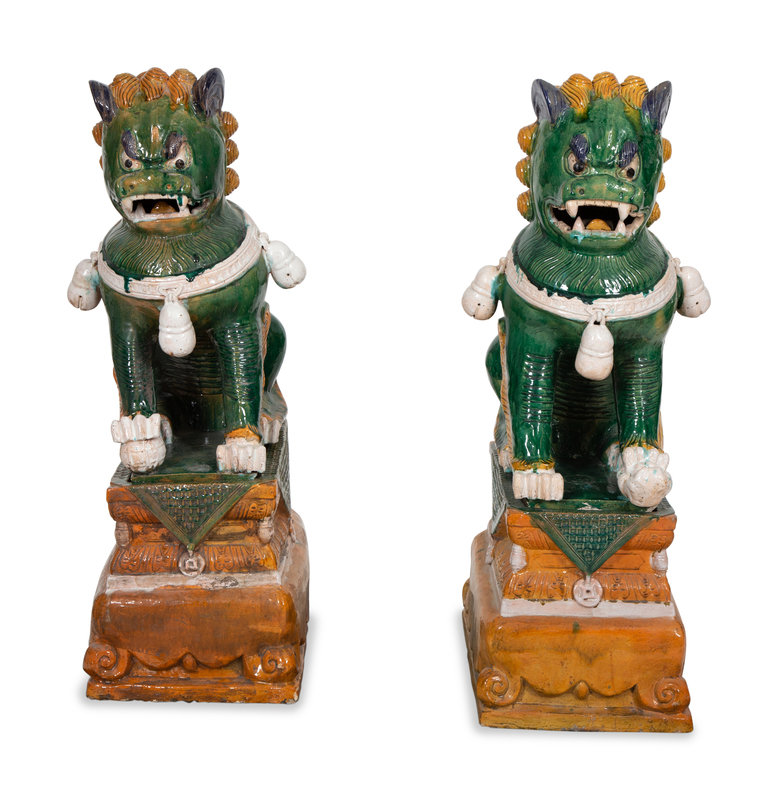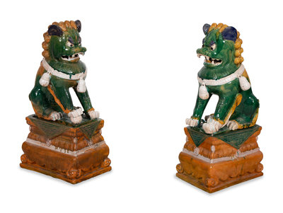 A Pair of Chinese Sançai Glazed Ceramic Guardian Lions on Pedestal Bases