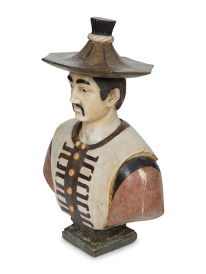 Height of bust 31 x width 22 1/2 inches; pedestal height 39 1/2 x 12 1/2 inches square top.