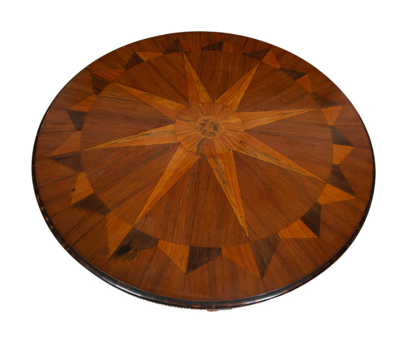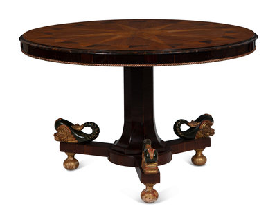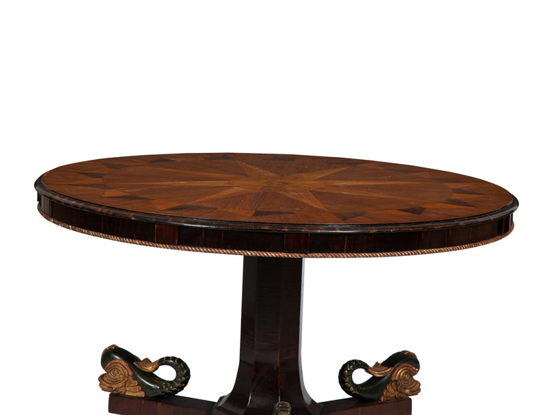 An Italian Parquetry, Ebonized and Parcel Gilt Extending Dining Table