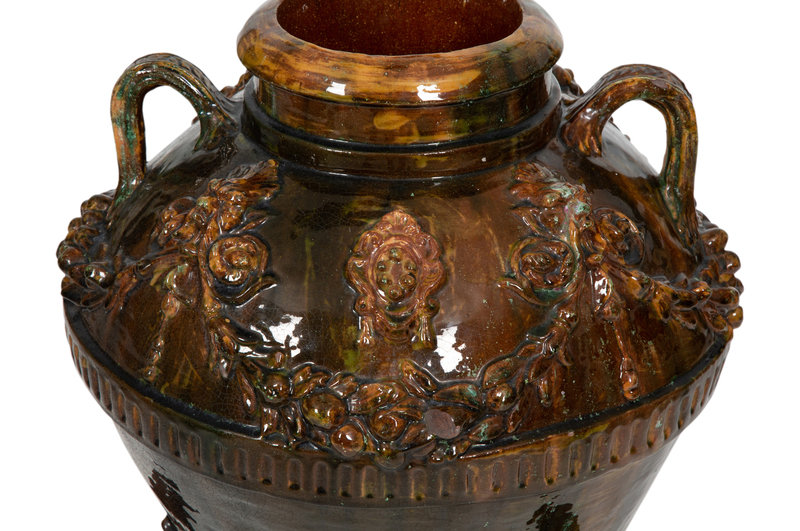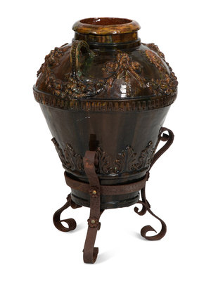 Italian Brown Glazed Ceramic Amphora in an Iron Stand