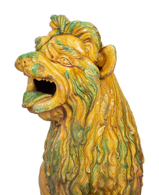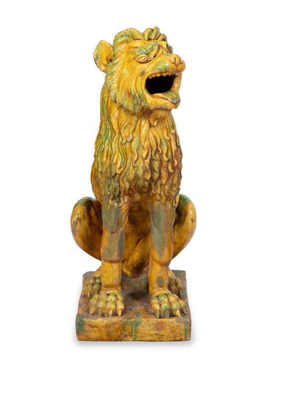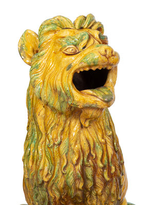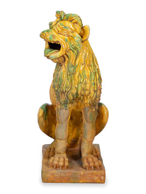 A Pair of Italian Yellow and Green Glazed Ceramic Figures of Seated Lions