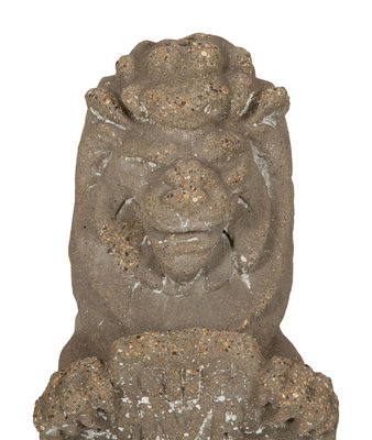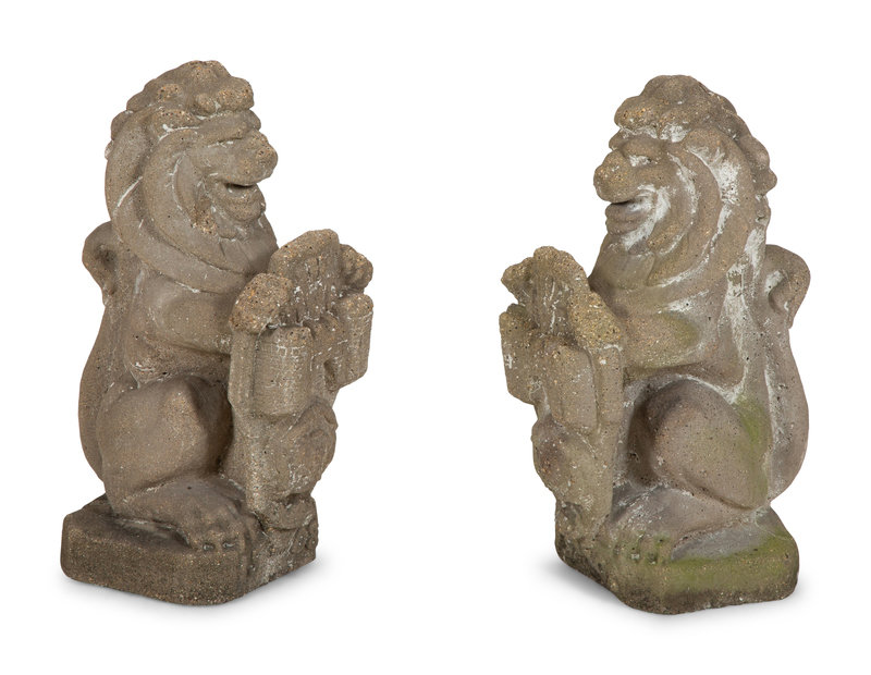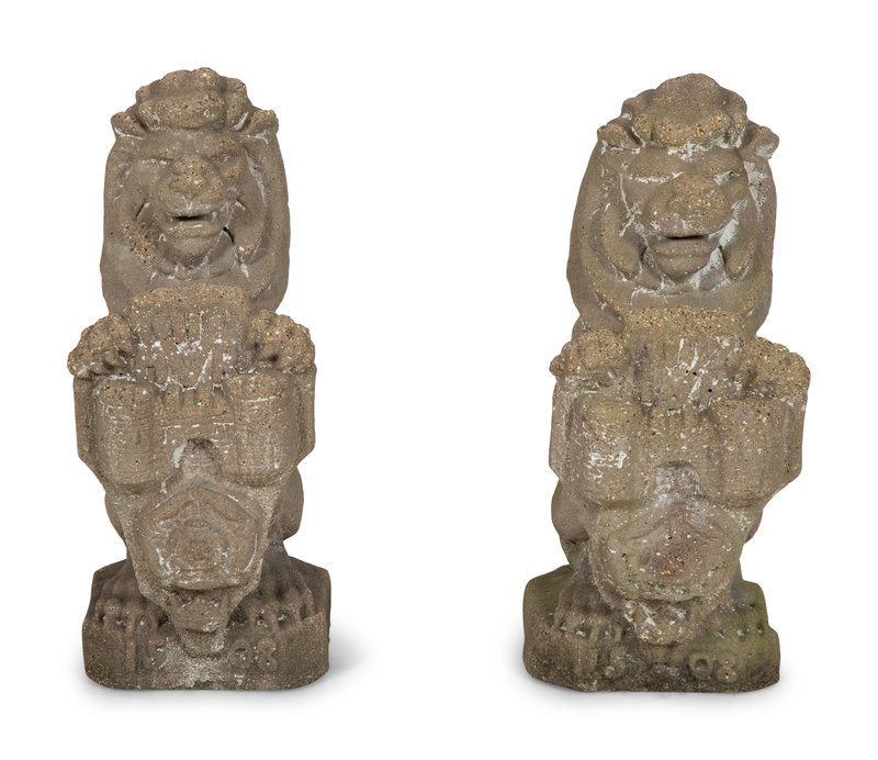 A Pair of Cast Cement Lions Holding Armorial Shields