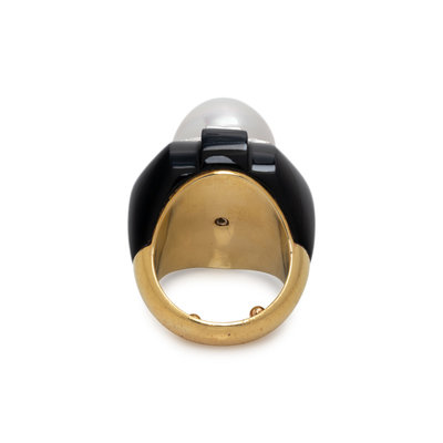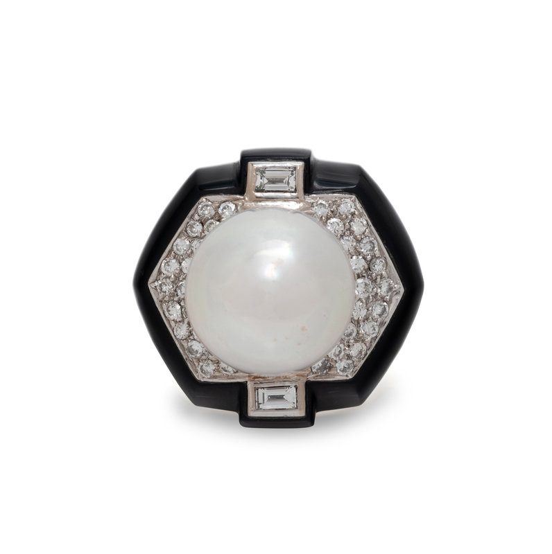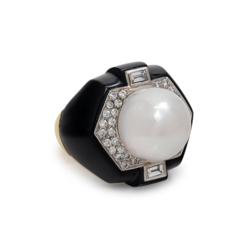 CULTURED SOUTH SEA PEARL, DIAMOND AND ONYX RING