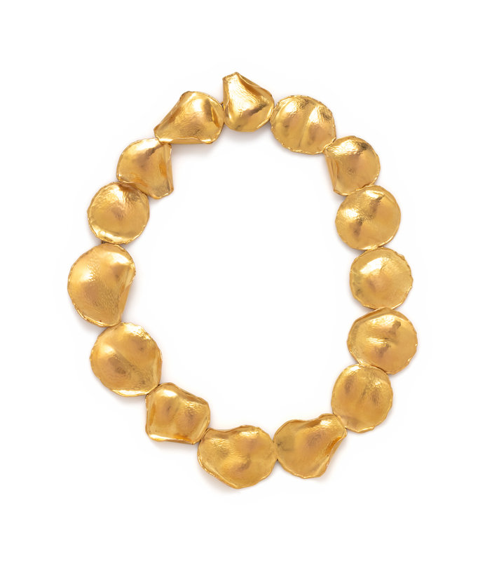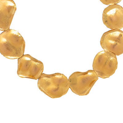 Consisting of 15 sculpted link petals with hammered and matte finish. 17 1/2 inches long.