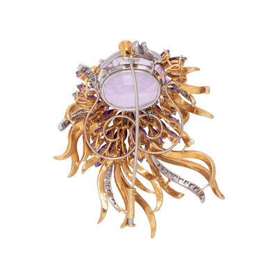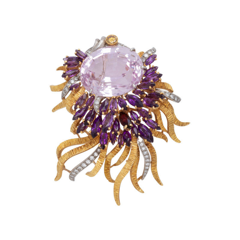 Containing one oval mixed cut kunzite measuring approximately 20.40 x 24.50 x 14.30 mm, one round brilliant cut colored diamond (origin of color not tested) weighing approximately 0.25 carat, 33 marquise mixed cut amethysts, one marquise mixed cut garnet and numerous single cut diamonds. Mounted in yellow gold and platinum. 2 1/2 x 2 inches.