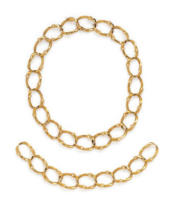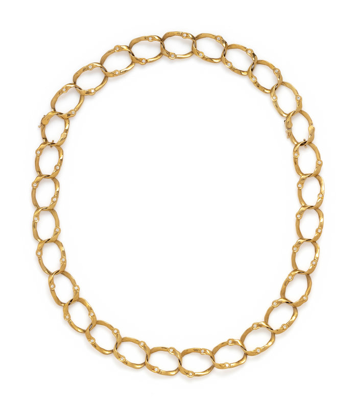 Consisting of organic designed oval links containing 54 round brilliant cut diamonds weighing approximately 1.65 carats total with a removable section to shorten the necklace. 15 and 21 1/2 inches long.
