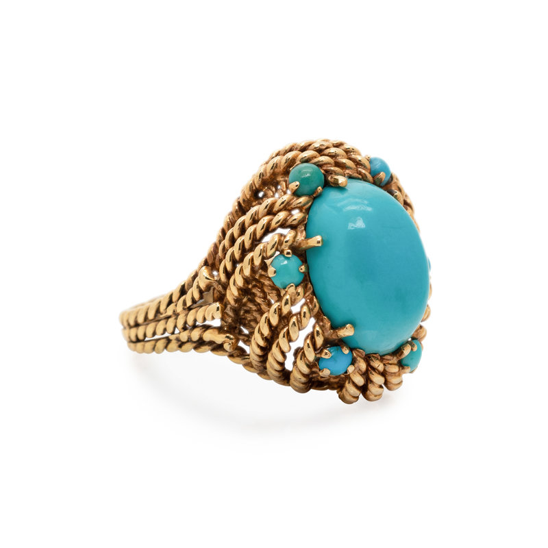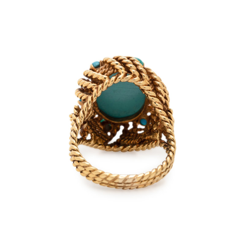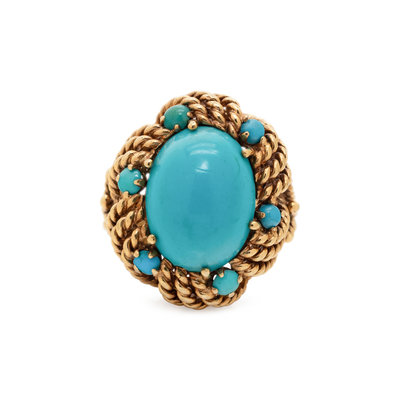 Containing one oval cabochon turquoise measuring approximately 16.00 x 12.00 mm and six round cabochon turquoise in a twisted gold texture. Ring size 9 1/4.