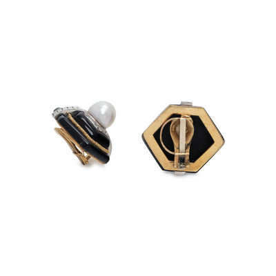 CULTURED PEARL, DIAMOND AND ONYX EARCLIPS