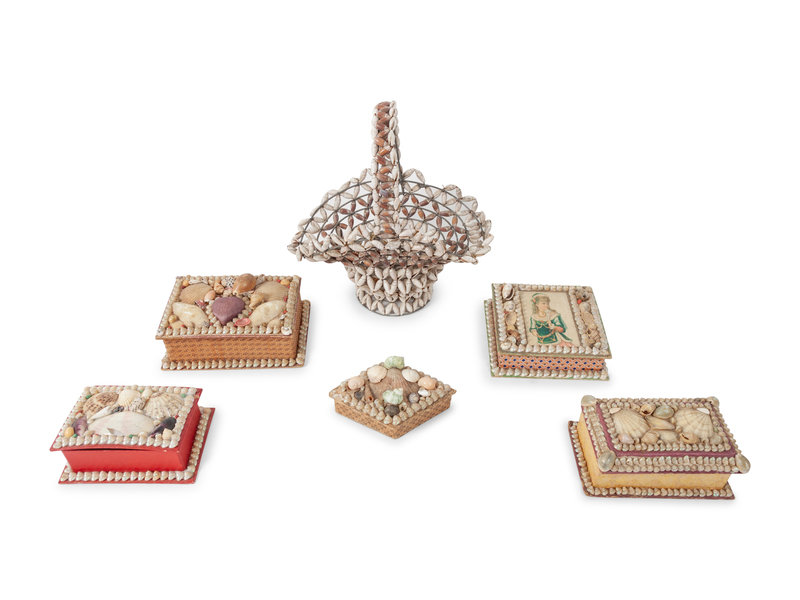 including eleven Victorian era folk art sailor-made shell boxes and one shell basket.