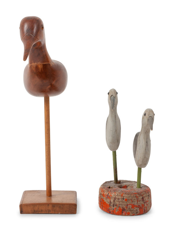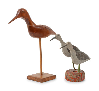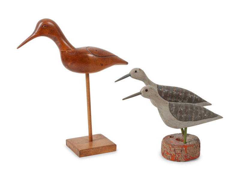 each with glass eyes, with the double shorebird featuring polychrome paint.