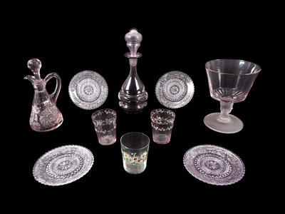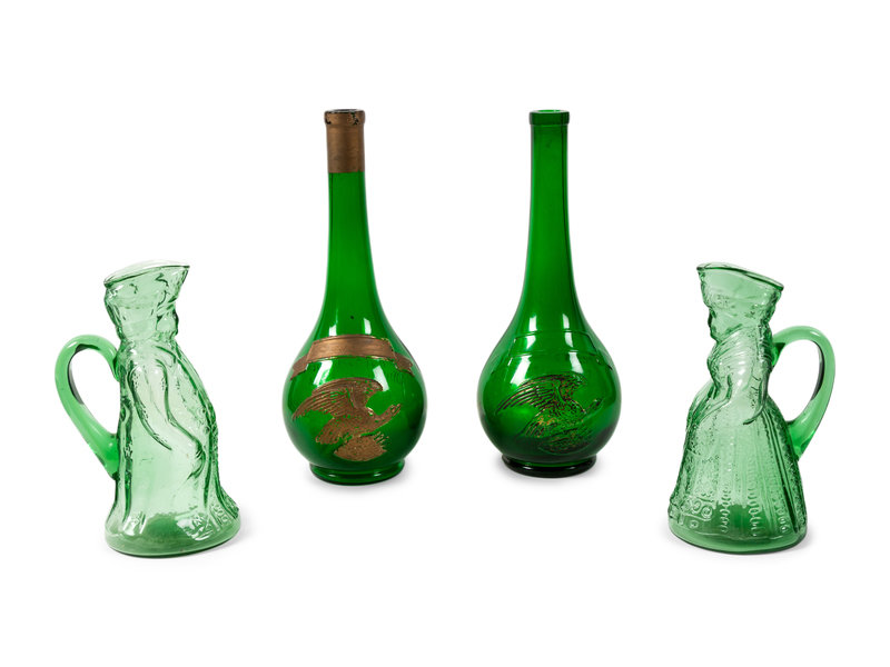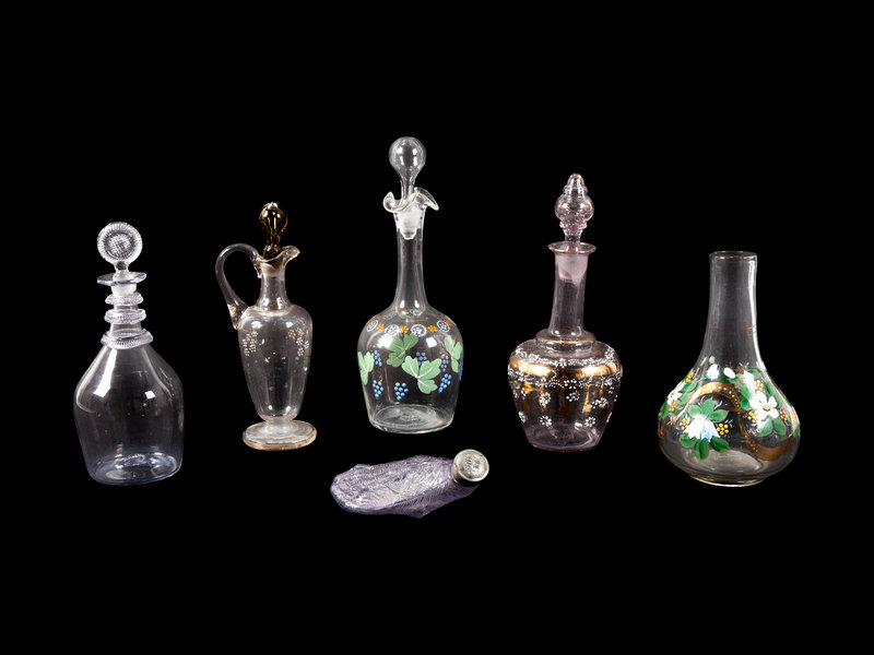 including four blown glass decanters with stoppers (two are enamel-decorated), one blown and enamel-decorated glass vase, three blown and enamel-decorated glass cups, two glass pitchers with stoppers (one is cut glass, one is blown glass with enamel decoration), two figural pitchers with applied handles, one shell form flask, two gilt-decorated molded glass bottles reading Rheinstrom Bros, Cincinnati, one chalice and four cut glass plates; 19 items total.
