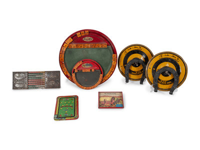 including a Poosh-M-Up game, a 5 in 1 Electric Poosh-M-Up game, two Poosh-M-Up Jr. 4 in 1 games, The Covered Wagon game, The Locke Adder game, a Sto Auto Race game, a Sto Horse Shoe game and two Foxy Toys spelling games; 10 items total.