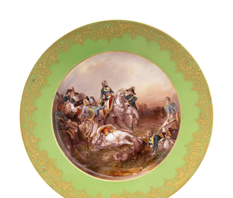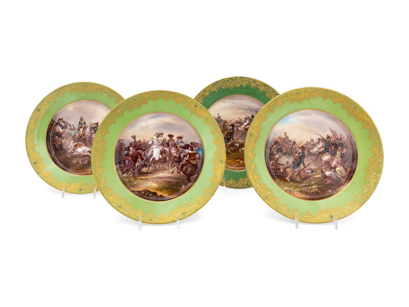 painted to depict battle scenes, each signed in image, bearing markings for Limoges and respectively titled Bataille de Crécy, Bataille d'Elau (sic), Bataille de Fleurus (two examples) to the underside.