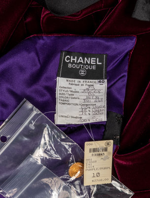 Evening dress of purple silk velvet trimmed with a black silk ribbon around the waist and around the neck. The neck ribbons attach to the top of the dress with goldtone Chanel buttons to form the straps. The dress is lined with pruple satin and closes at the center back with a fold-over panel with hooks and eyes and snaps. Comes with an extra button and with the attached retail label listing price at $2760.00.