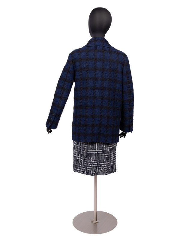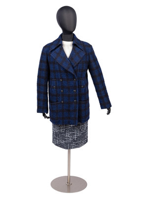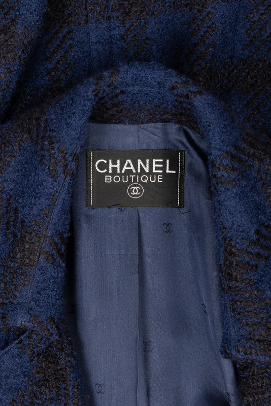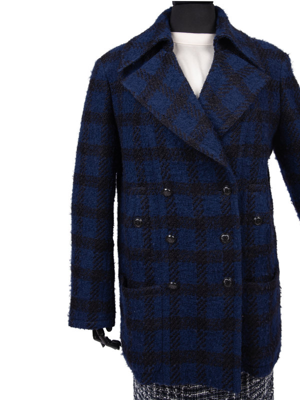 Coat of blue and black boucle with notched lapel, long sleeves, double-breasted button closure, and front buttoned pockets. The coat's lining is woven with the CC logo.