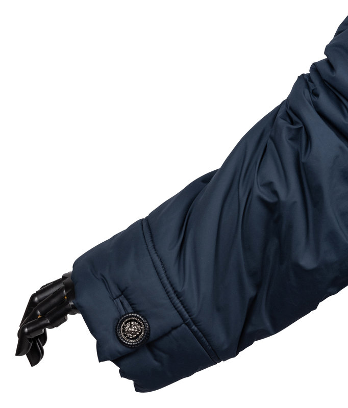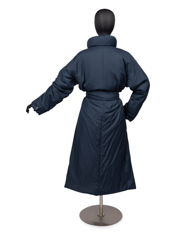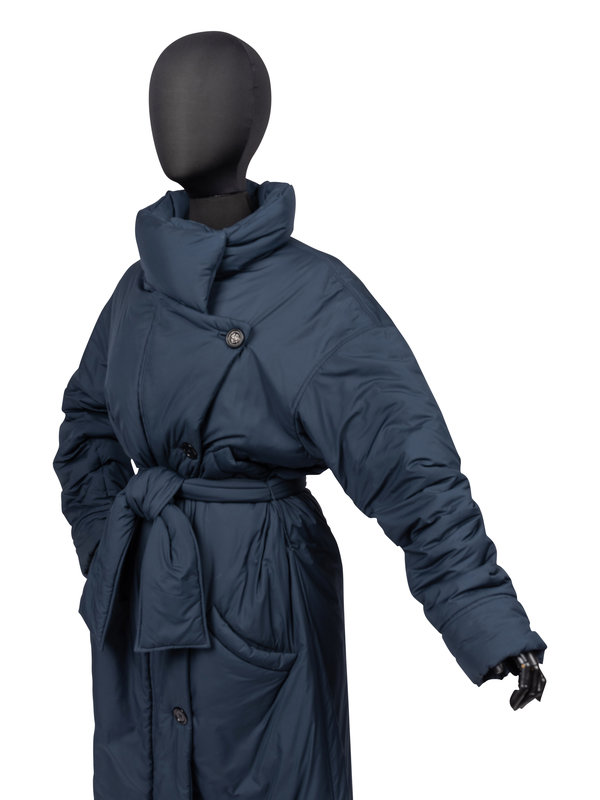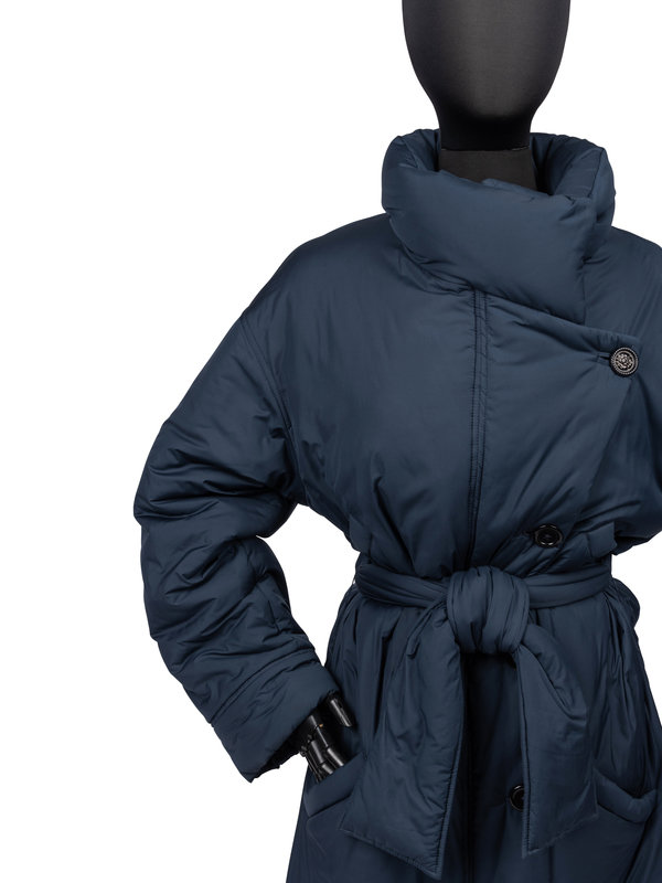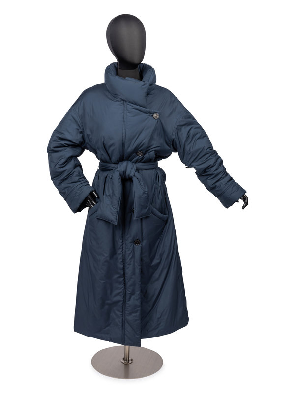 Blue puffer coat with stand collar, long sleeves, center front button closure, and self fabric belt. Comes with two extra buttons.