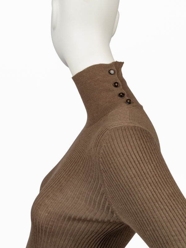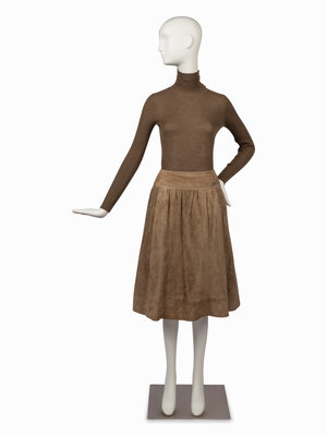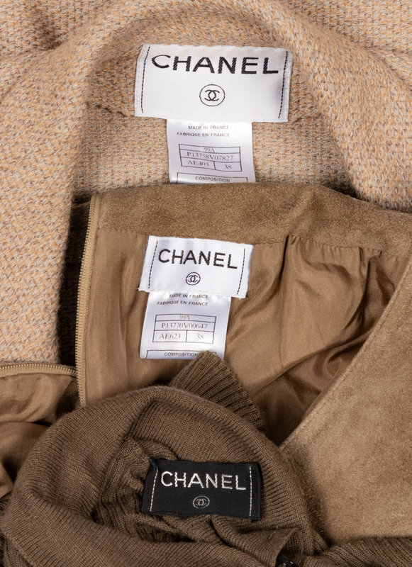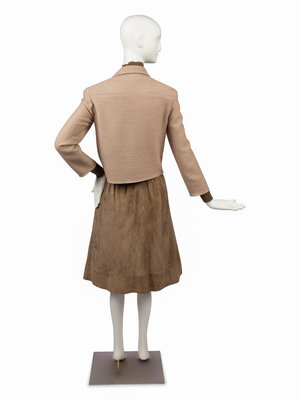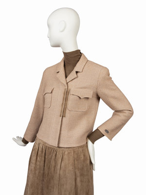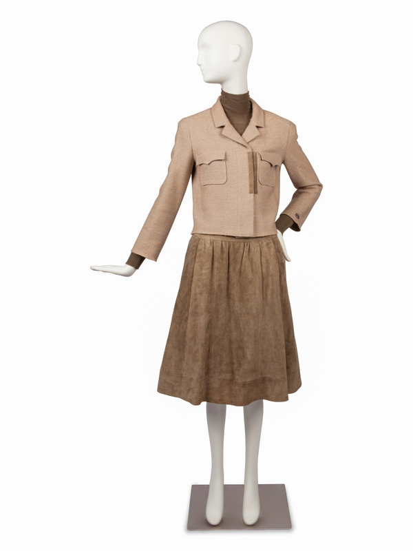 Tan wool/alpaca woven jacket with notched lapel, set in long sleeves, two front chest flap pockets, and off-center hook and eye front closure with matching tan suede skirt. The unlined jacket is trimmed with a panel of suede that matches the skirt and is finished at the hem on the inside with a silver-tone chain. The sweater is a long sleeve turtle neck with CC logo buttons down the left side of the neck opening. The flared tan/green suede skirt is cut in panels and gathered into a wide waistband. There is a pocket over each hip, a metal decorative piece on the left hip that reads "Chanel / Paris" and the skirt closes with a zipper.
