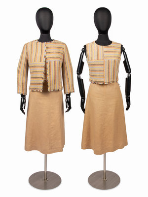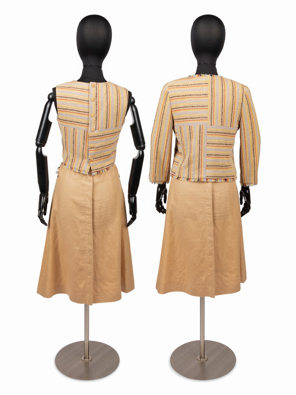 Tan wool jacket with muli-colord woven stripes, frayed trim, set in long sleeves, and hook and eye front closure with matching cropped sleeveless top with crew neckline, frayed hem, and center back zipper closure; paired with a tan wool skirt with multi-colored frayed trim and center back zipper closure.