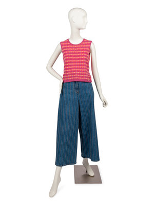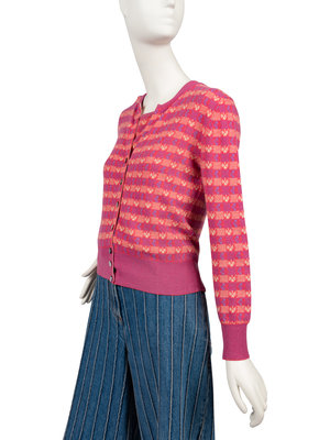 Pink, purple, and white wool gingham check sweater with v-neckline, striped waistband, and center front button closure with matching sleeveless top.