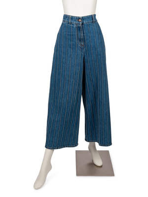 Blue jeans with striped detiling throughout, two front hip slit pockets, and two back pockets with "CC" topstitching detail.