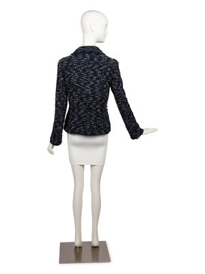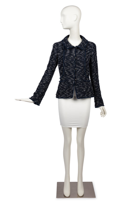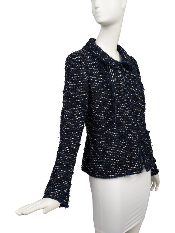 Blue and white tweed jacket with standard collar, set in long sleeves, two front hip patch pckets, two front slit pockets, frayed trim, and center front button closure.
