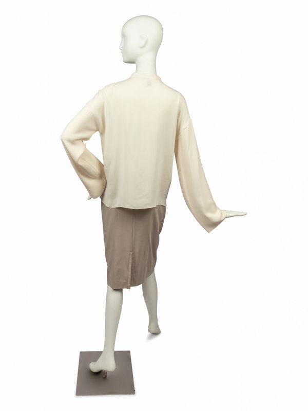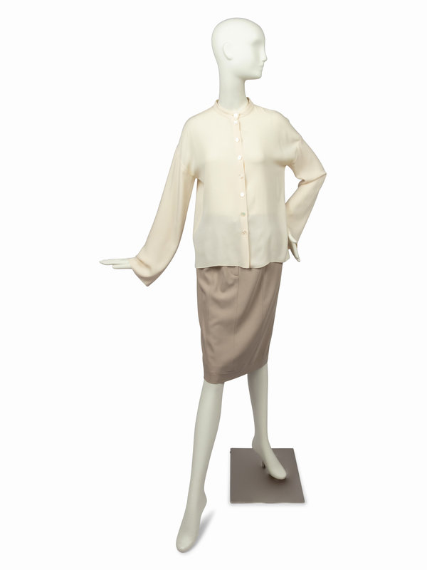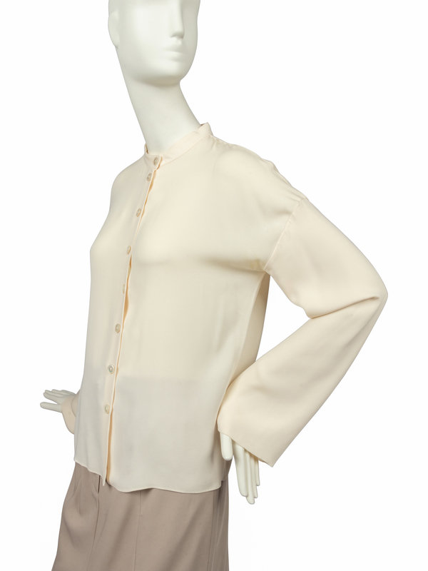 White silk crepe shirt with a band collar, long sleeves cut in two layers, and a center front button closure.