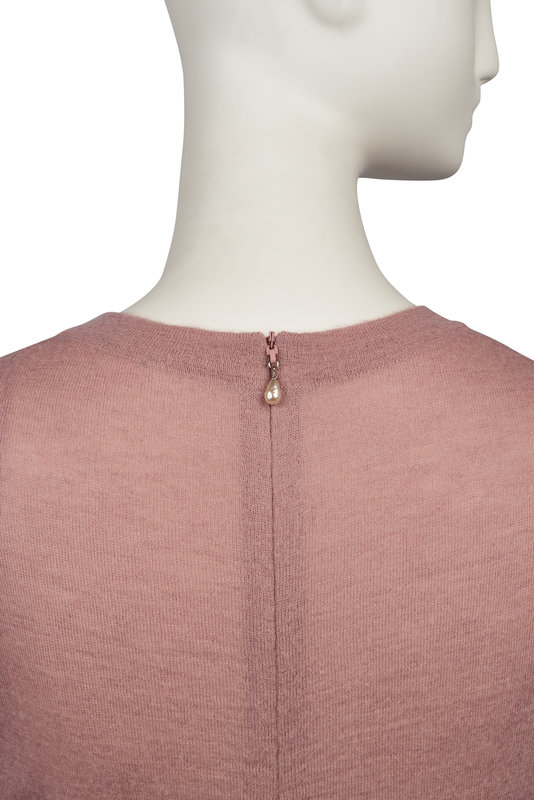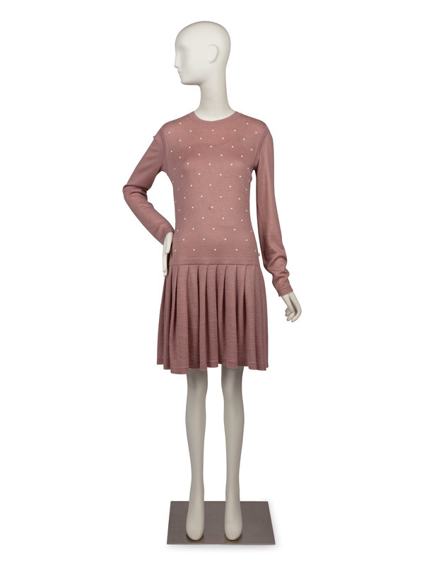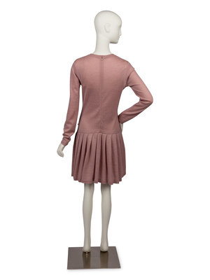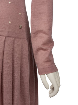 Pink wool knit dress with crew neckline, set in long sleeves, a pleated skirt, faux pearl detailing on bodice, and center back zipper closure.