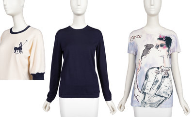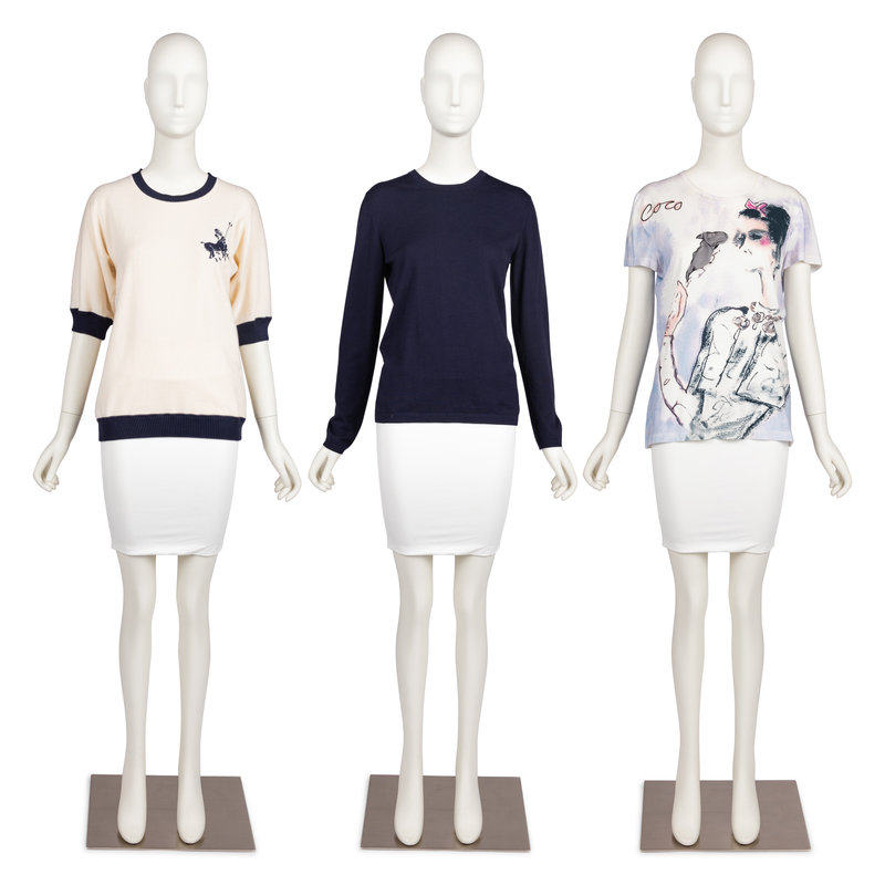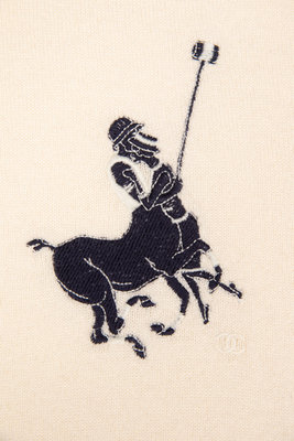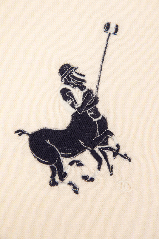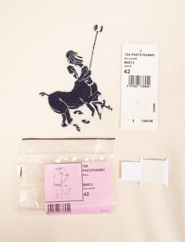 White cashmere knit top with crew neckline, short sleeves, navy blue ribbed trim, embroidered logo on back of neckline, and embroidered polo player carrying a woman on the front. Comes with replacement thread and denotes original retail tag with price of $1,280.00.