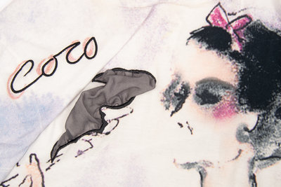 White, purple, and blue cotton top with crew neckline, set in short sleeves, "Coco" embroidered detail, and print of a woman smoking with grey chiffon gathered fabric denoting cigarette smoke.