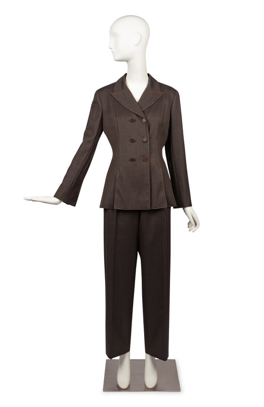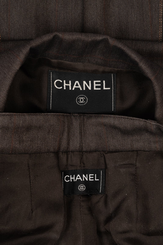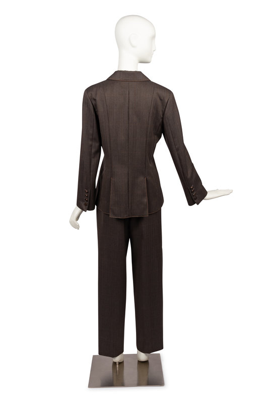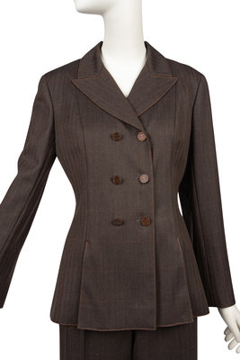 Brown silk blend double breasted jacket with herringbone pattern, notched lapel, set in long sleeves, gold-tone top stitching trim, and double row of buttons as front closure; paired with matching pleated pants with two front hip slit pockets, belt loops, and front zipper and button closure.
