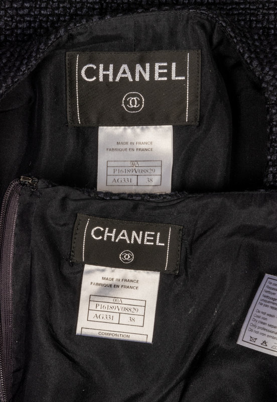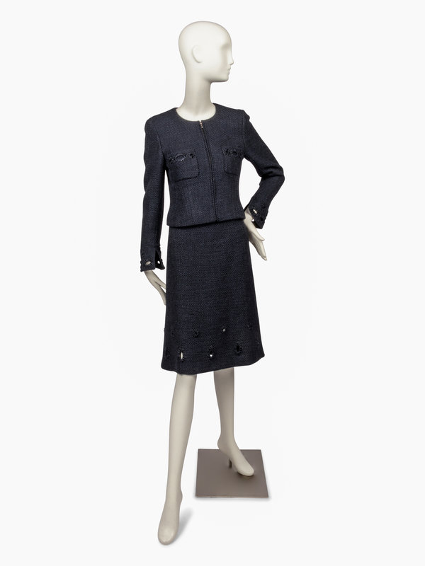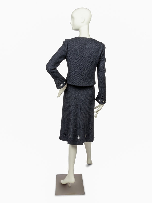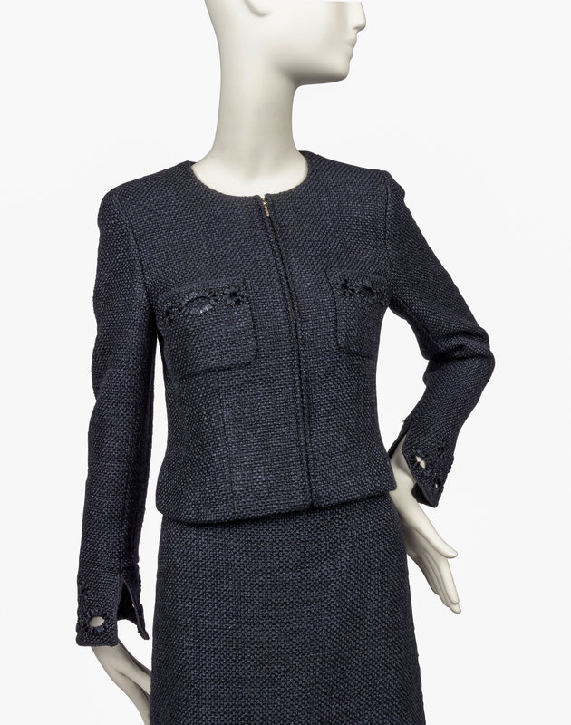Navy blue wool woven fabric suit with cropped jacket, crew neckline, set in long sleeves, two front chest patch pockets, eyelet detailing on sleeve hems and pockets, and center front zipper closure ; paired with matching navy blue wool woven skirt with eyelet details, and center back zipper closure.