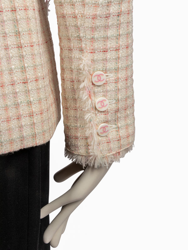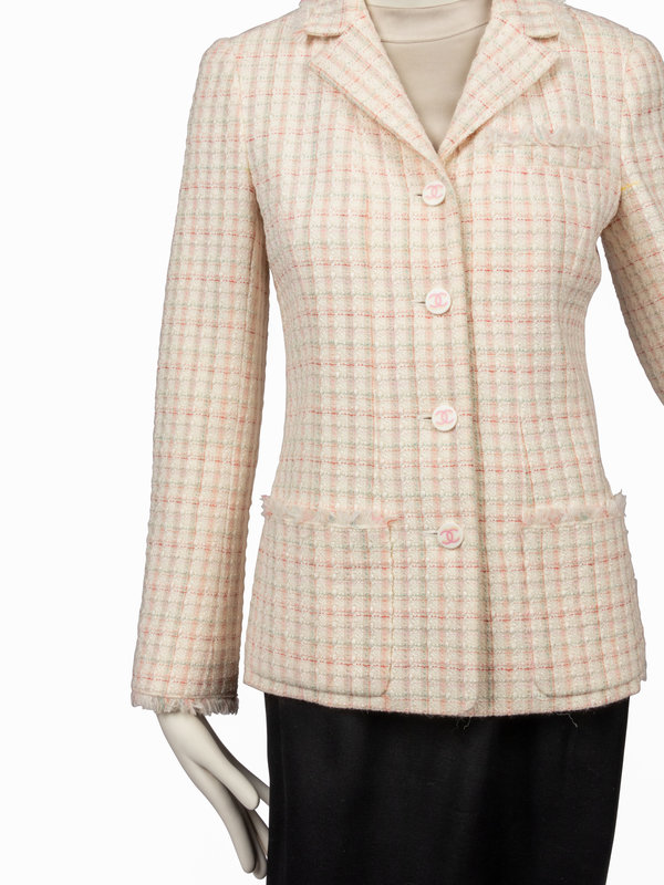 White tweed jacket with multi-colored plaid stitching, notched lapel, two front hip patch pockets, single front chest faux welt pocket, frayed trim, and center front button closure.
