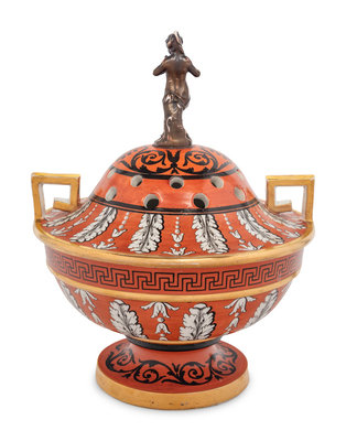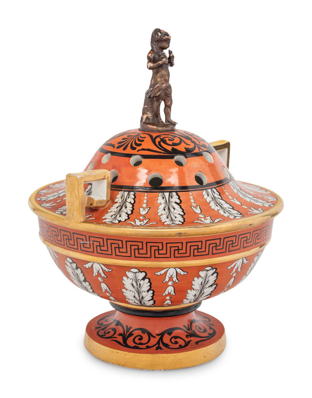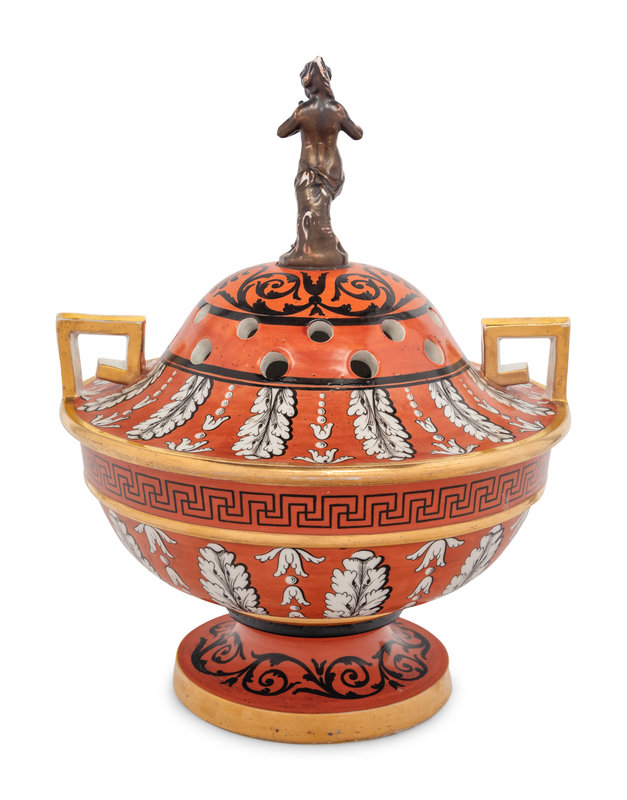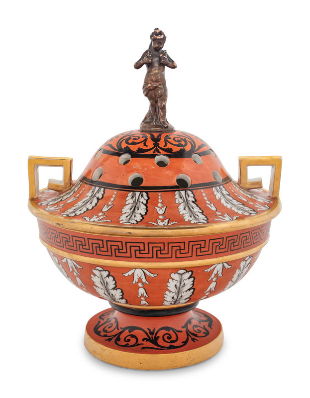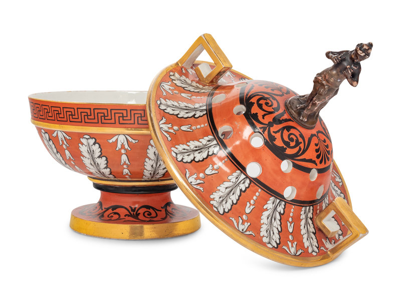 An English Neoclassical Orange-Ground Porcelain Potpourri Bowl and Cover
