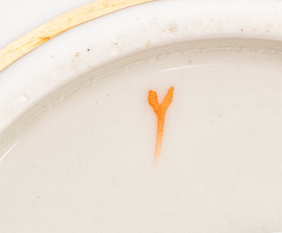 comprising a meat platter, unmarked; seven teacups, one unmarked, six marked Y in iron-red; eight large plates, six impressed V:, two with gilt H and eight small plates marked Y in iron-red; 25 items total.