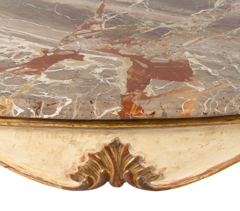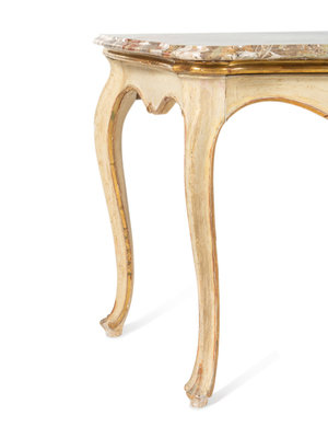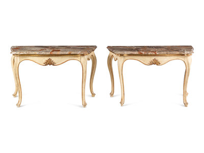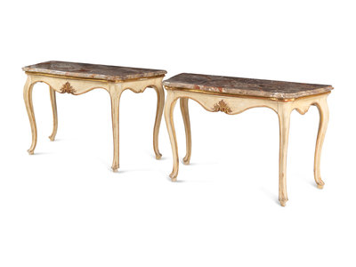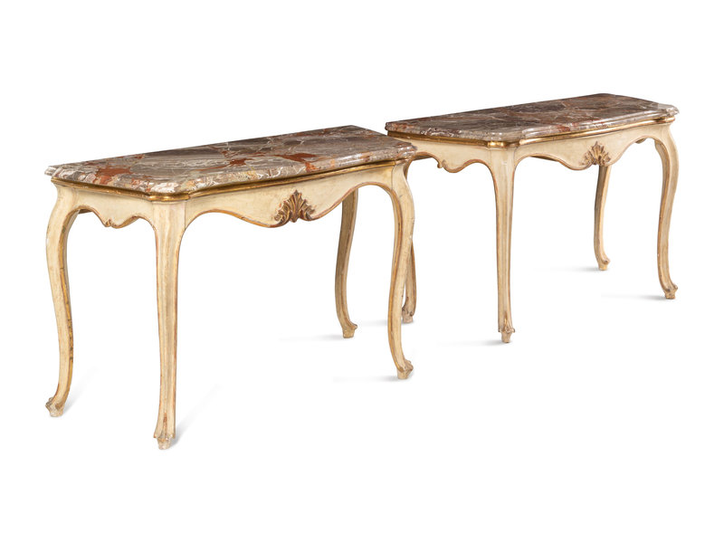 A Pair of Italian Painted and Parcel-Gilt Marble-Top Console Tables