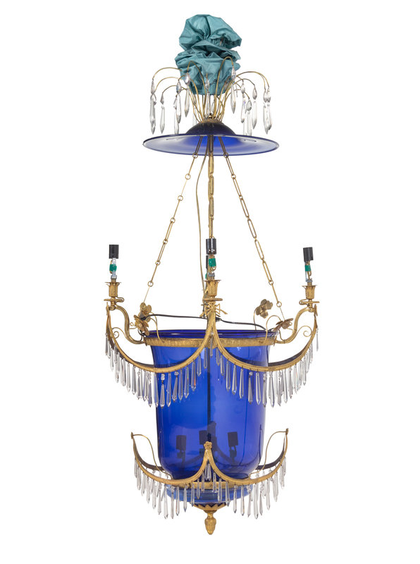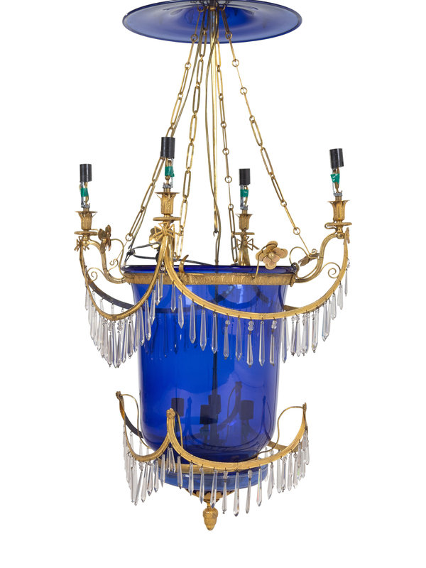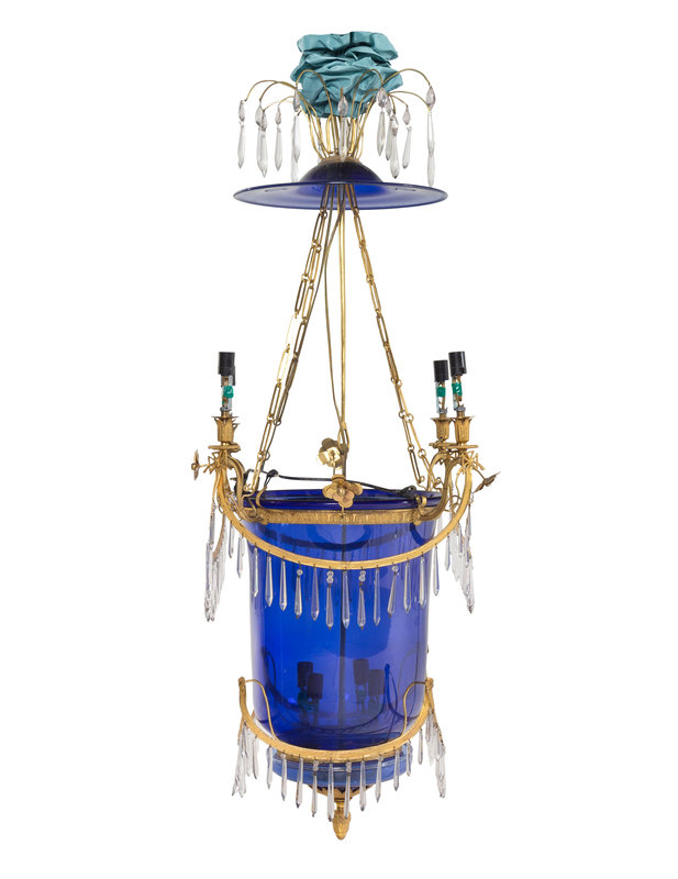 A Russian Gilt Metal, Cobalt and Colorless Glass Four-Light Hall Lantern