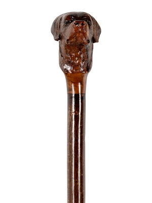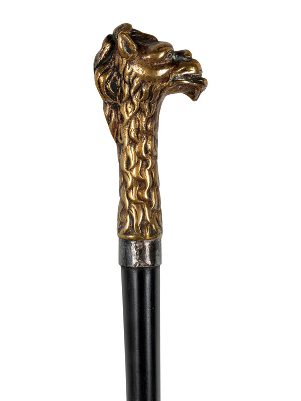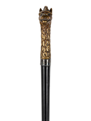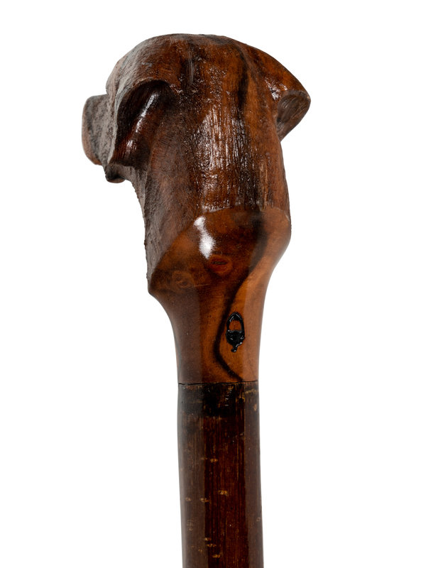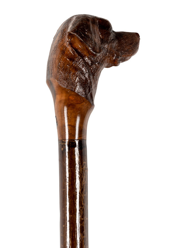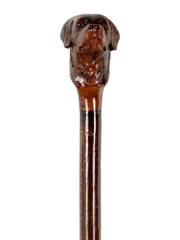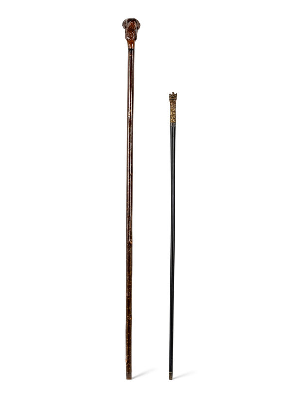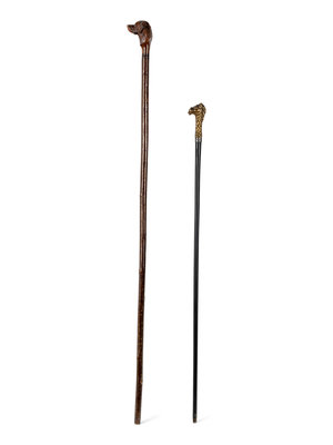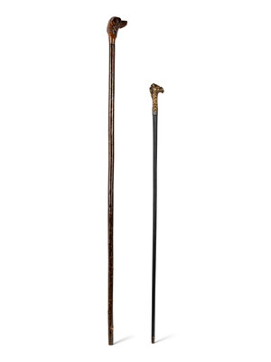 comprising a stained and carved wood cane with dog’s head motif and a cast brass-handled cane with stylized lion motif.