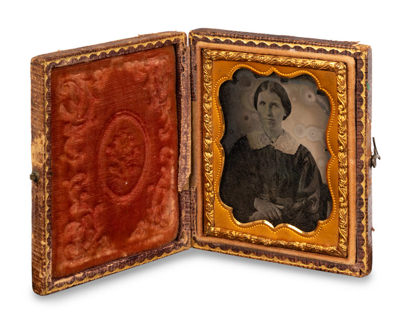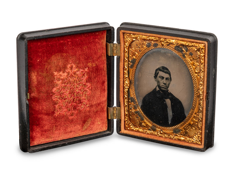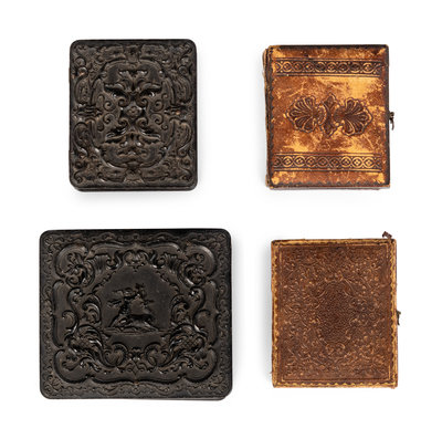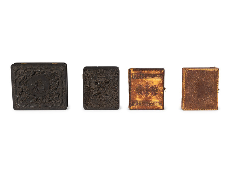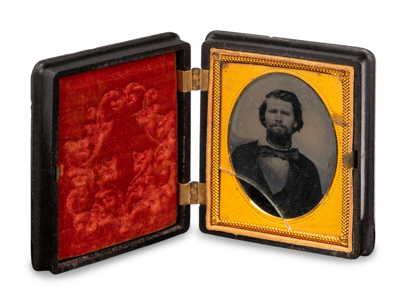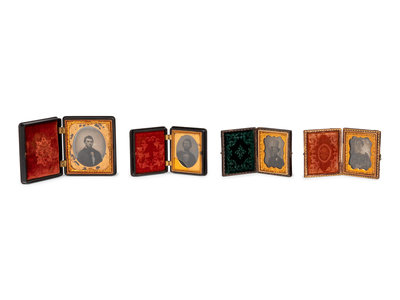 Sixth plate tintype of a young man wearing a large bowtie, housed in Union case, Cupid and Wounded Stag (tarnish to perimeter of image, some surface scratching). -- Ninth plate tintype of a man sporting a mustache and beard, wearing a large bowtie, housed in Union case with scroll design (image dark, crack to cover glass). -- Ninth plate tintype of a distinguished gentleman wearing a top hat, housed in a pressed paper case. -- Ninth plate tintype of a woman, housed in leatherette case (some spotting and tarnish to plate, scuffing to case).