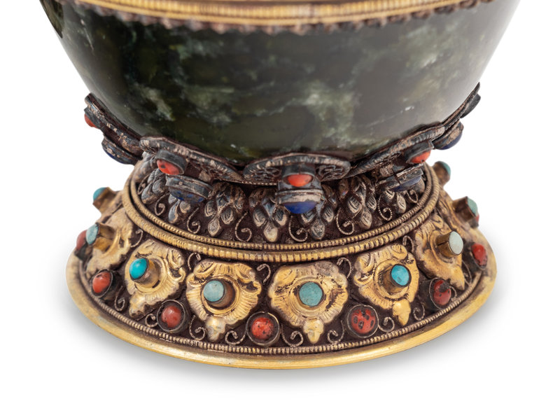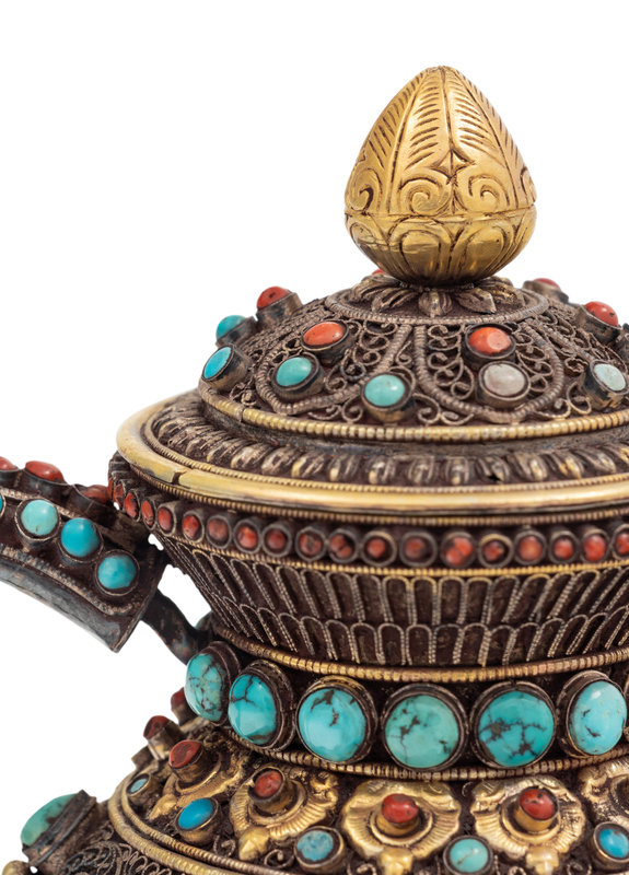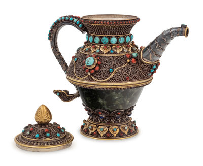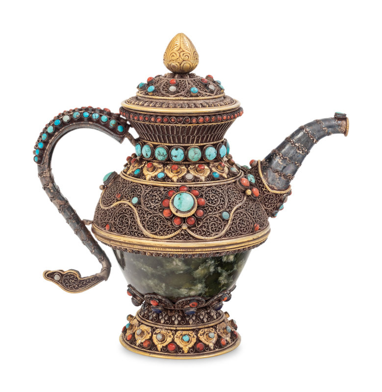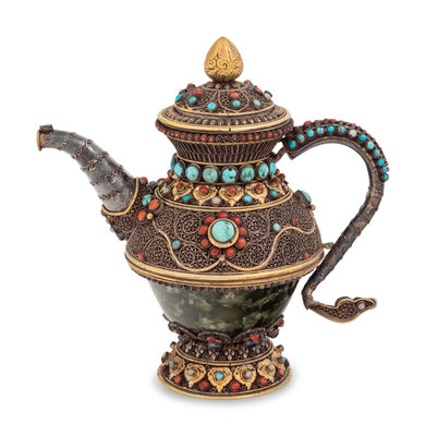 A Tibetan or Himalayan Hardstone Mounted Silver Teapot