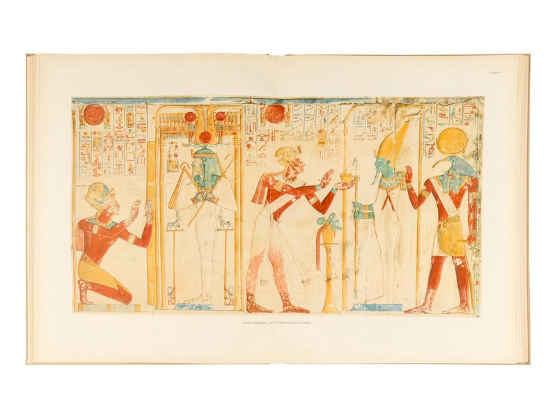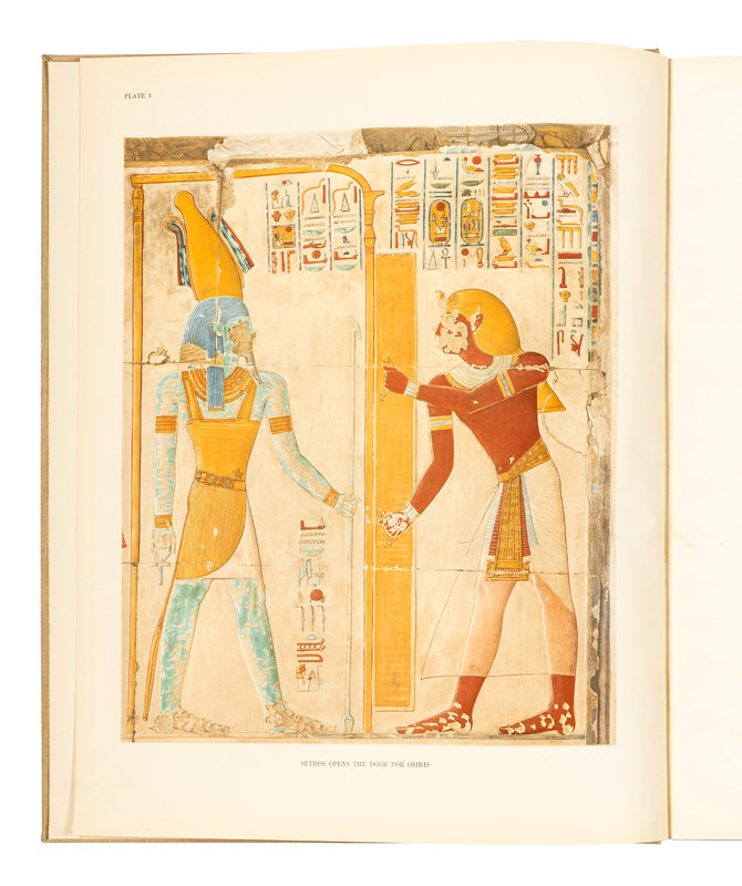 FIRST EDITION of this monumental work covers the temple complex of King Sethos I at Abydos, Egypt. Published over 25 years based on the accurate drawings by Egyptologists Amice M. Calverley and Myrtle F. Broome, the publication was funded by John D. Rockefeller, Jr. after a visit to the site in the early 1930's where he was so impressed by the painted reliefs and Calverley's drawings.