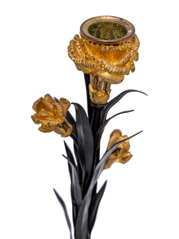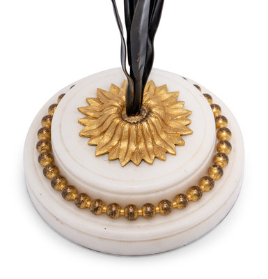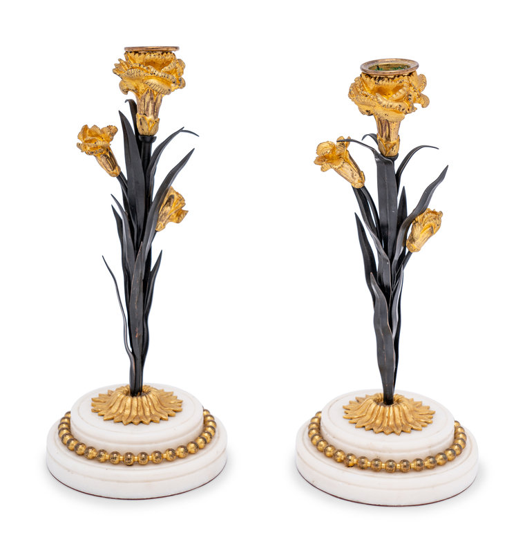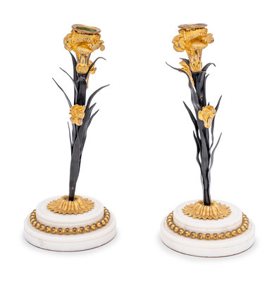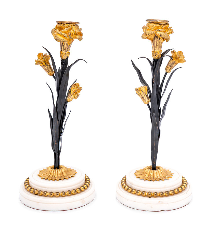 A Pair of French Tôle, Gilt Metal and Marble Candlesticks